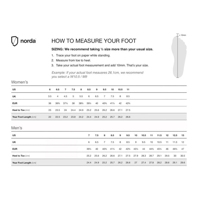 norda™ Lock System - Ultra light and comfortable sock, gusset construction for the ultimate fit. The foot is held in place to provide stability as you run through ever changing conditions.