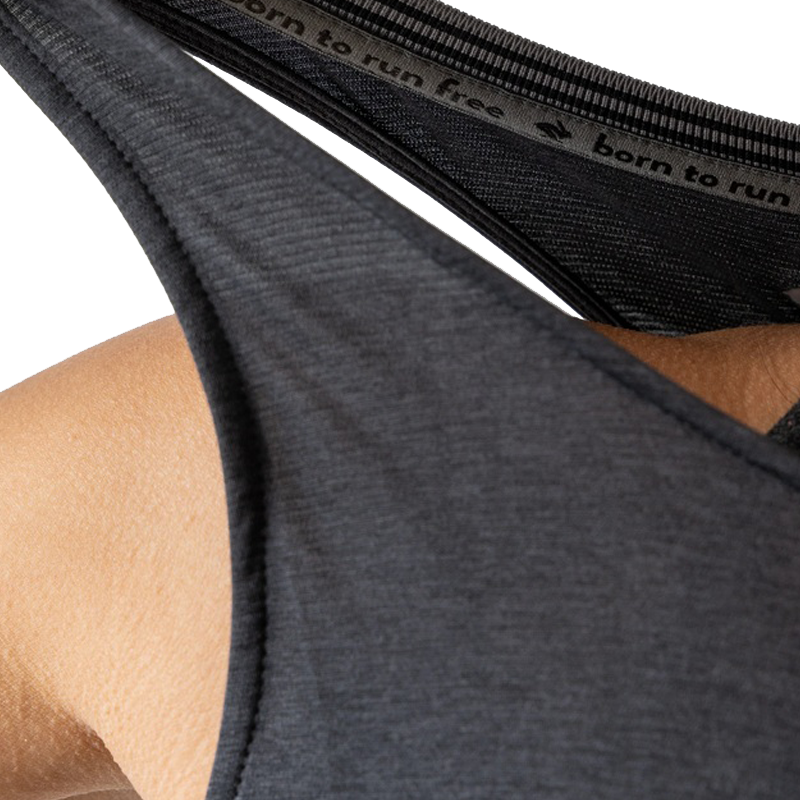 A v-notch at base of each side seam allows freer movement. Extra details include: comfort neck tape that reads “born to run free,” a striped rib knit trim at back neck, and reflective heat transfers at side slits.