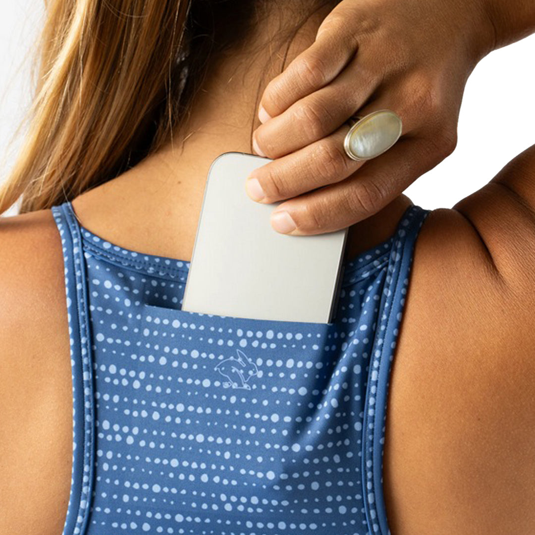 You pick your goodies. rabbit provides the pocket. The Strappy Pocket Bra will comfortably carry most phones, or anything else you need, in rabbit's classic centre back pocket with minimal bounce and the straps allow hours of comfort. Designed to provide moderate support for runners with A/B or B/C cups.
