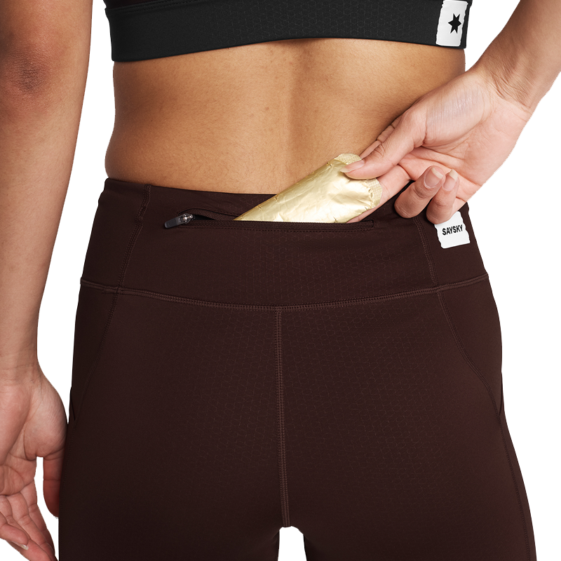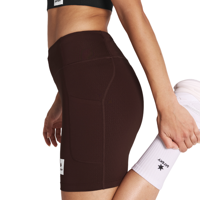 The SAYSKY Combat+ Short Tights 7" are women's running tights made from recycled polyester. They feature side pockets for essentials and a back zip-pocket for keys or gels. Designed for performance, these short tights offer a comfortable and supportive fit for intense training and race day efforts.