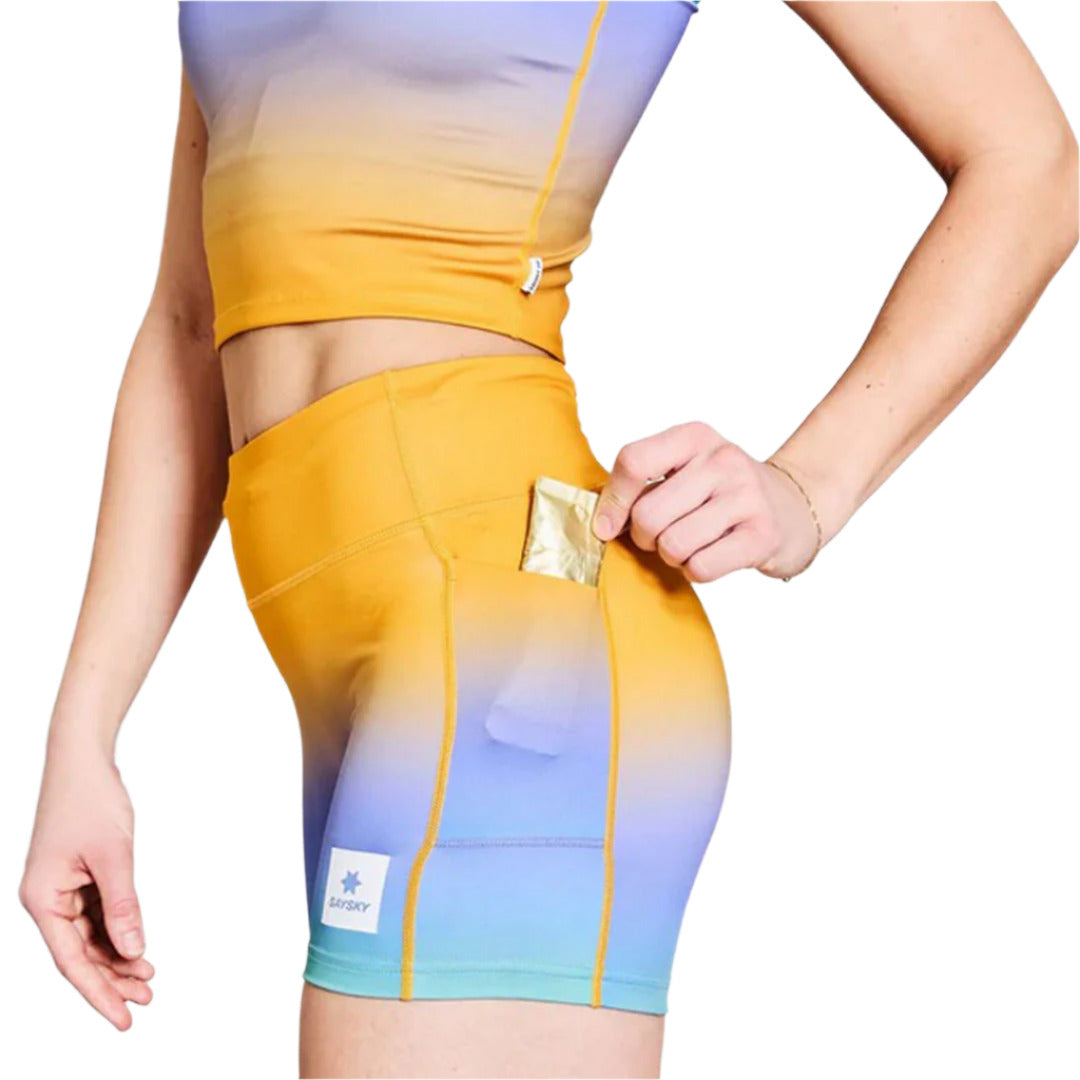 The SAYSKY Drip Dye Combat+ Short Tights 4" are women's running tights made from recycled polyester with an eye-catching dip dye print – just as refreshing as those summer runs you're dreaming of. They feature side pockets for essentials and a back zip-pocket for keys or gels. Designed for performance, these short tights offer a comfortable and supportive fit for intense training and race day efforts.