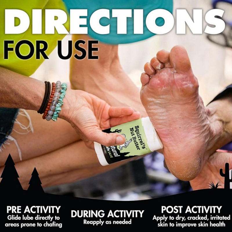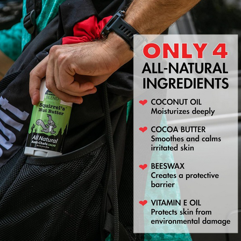 Protect areas of skin prone to chafing and blisters with the world's best all-natural, anti-chafe salve. Coconut oil and cocoa butter create a slick, lasting barrier on the surface of your skin to prevent rubbing and irritation. Beeswax makes the slick barrier effective and long-lasting as it holds the oil and butter in place to keep your skin moisturized and chafe-free. That's why the happiest squirrels butter their nuts!