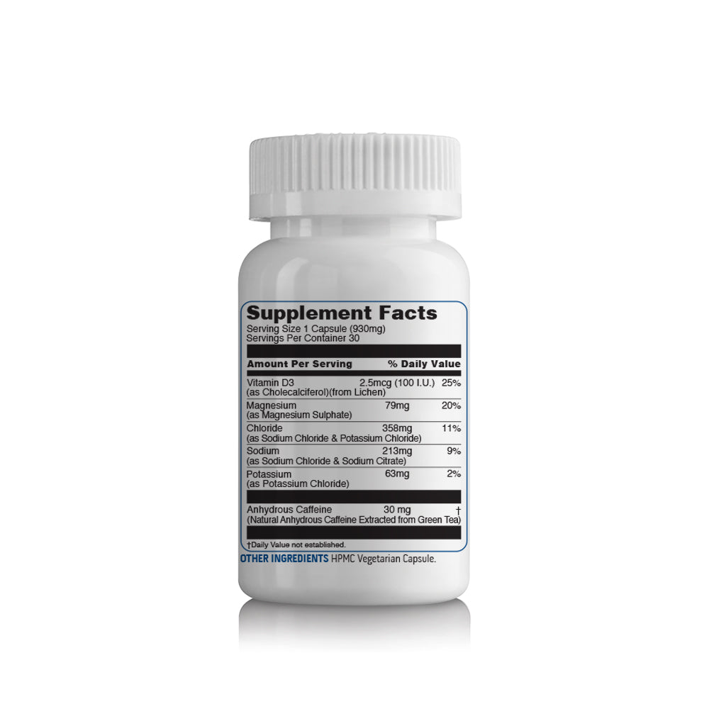 Chloride [as Sodium Chloride and Potassium Chloride], Sodium [as Sodium Chloride and Sodium Citrate], Potassium [as Potassium Chloride], Magnesium [as Magnesium Sulphate], Anhydrous Caffeine [from Green Tea], Vitamin D3 [as Cholecalciferol], HPMC Vegetarian Capsule